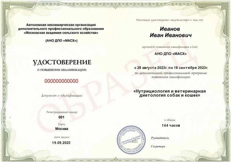 Нутрициология и ветеринарная диетология собак и кошек (144ч)