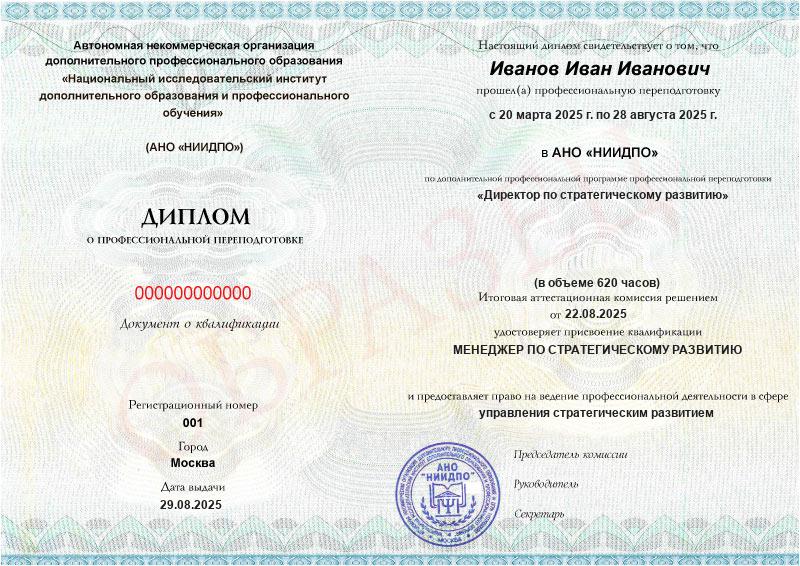 - Диплом о профессиональной переподготовке с квалификацией менеджера по стратегическому развитию