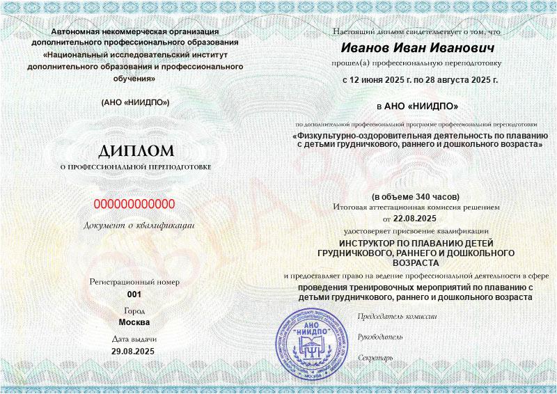 • Квалификация: Инструктор по плаванию детей грудничкового, раннего и дошкольного возраста