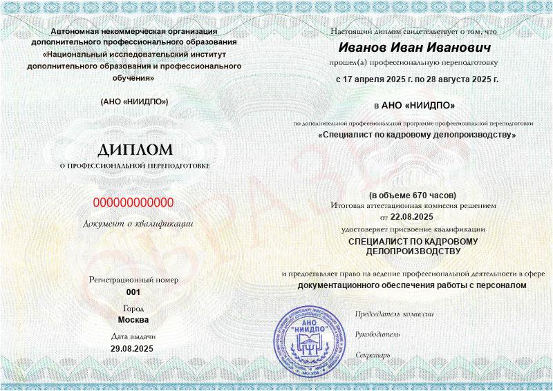 - Диплом о профессиональной переподготовке с квалификацией специалиста по кадровому делопроизводству