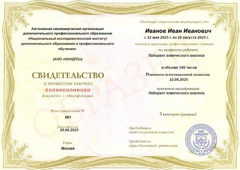 - Свидетельство АНО ДПО «МАСХ» о профессии рабочего с присвоением квалификации «Лаборант химического анализа» — выдается выпускникам со школьным аттестатом