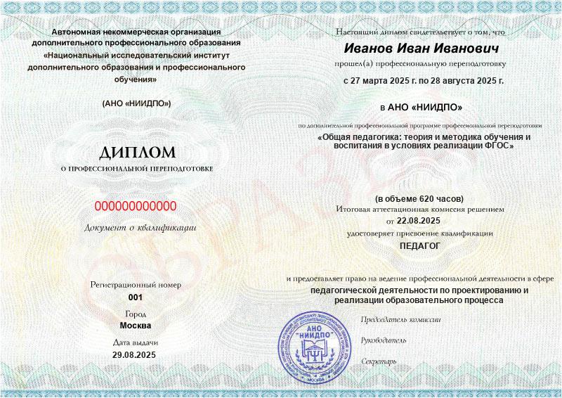 Студент, желающий поступить в АНО «НИИДПО», должен предоставить справку из образовательной организации. Независимо от срока окончания обучения по программе дополнительного образования, диплом о профпереподготовке выдаётся только после предъявления документа о получении среднего профессионального или высшего образования.