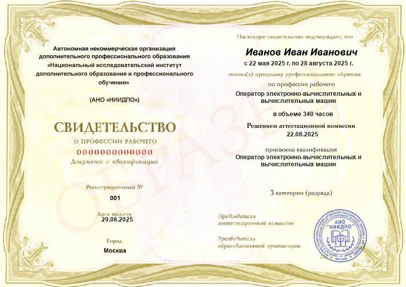 - Квалификация: Оператор электронно-вычислительных и вычислительных машин