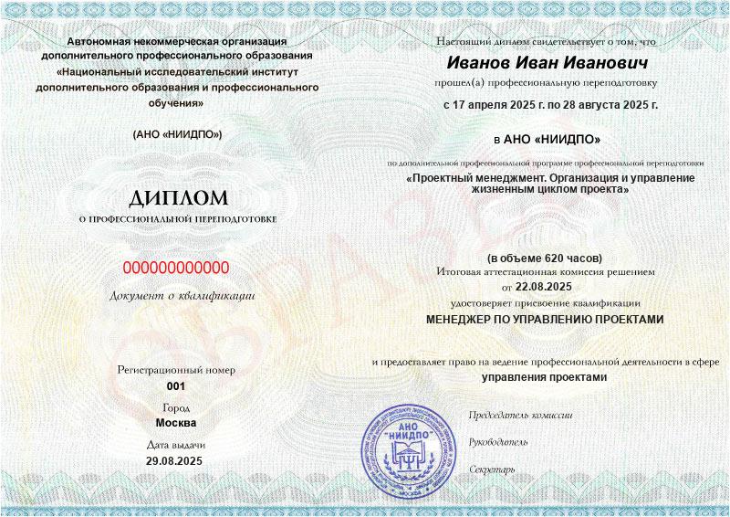 - Диплом о профессиональной переподготовке с квалификацией менеджера по управлению проектами