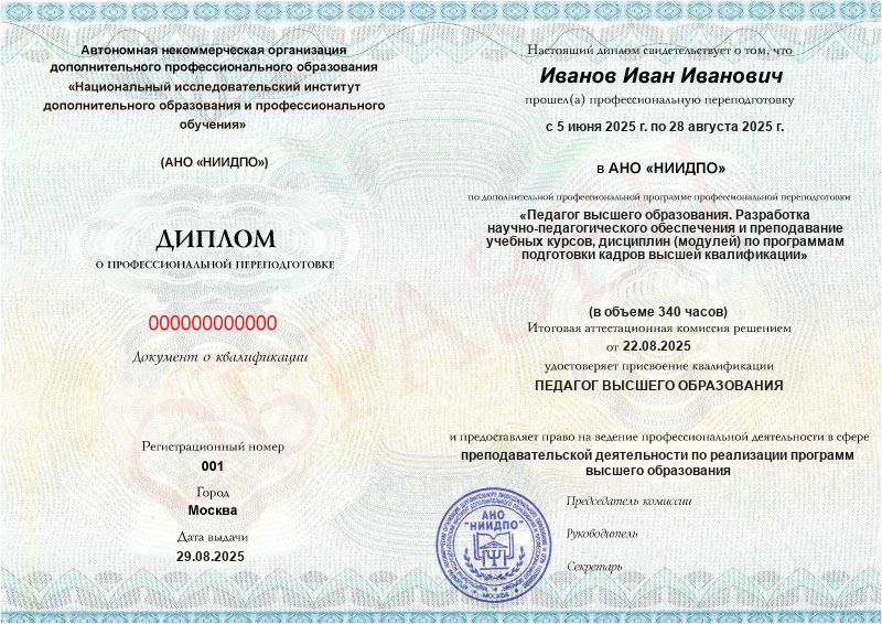 Педагог высшего образования. Разработка научно-педагогического обеспечения и преподавание учебных курсов, дисциплин (модулей) по программам подготовки кадров высшей квалификации (340ч)