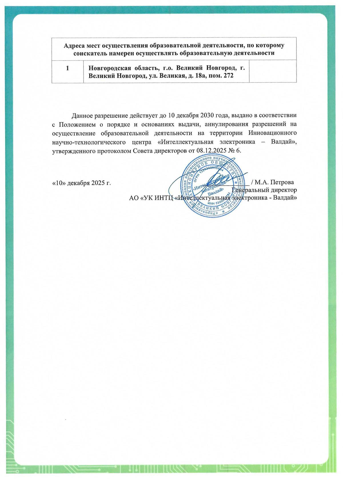 Разрешение на осуществление образовательной деятельности на территории Инновационного научно-технологического центра «Интеллектуальная электроника - Валдай» серии 2025-12-01 № 00001