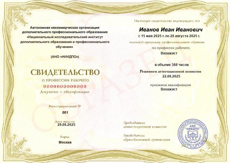 Обучающимся, завершившим обучение по основным программам профессионального обучения и успешно сдавшим квалификационный экзамен, выдается документ о квалификации – свидетельство о профессии рабочего или свидетельство о должности служащего, установленного образовательной организацией образца (в соответствии с Приказом Минпросвещения России от 26.08.2020 № 438).
