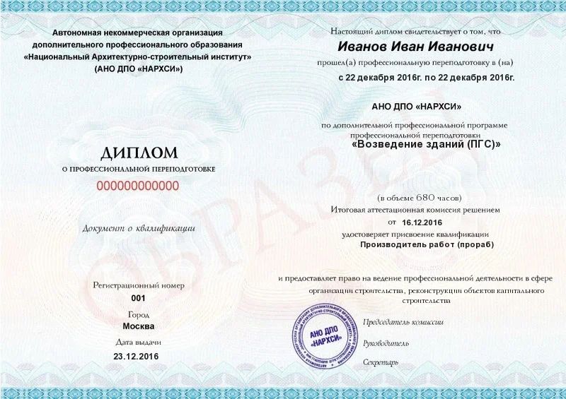 - Выдача диплома о профессиональной переподготовке с присвоением квалификации «Производитель работ (прораб)»